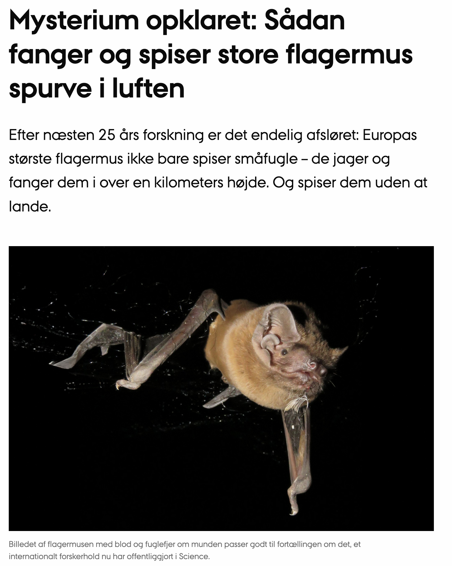 Et internationalt forskerhold med deltagelse fra Aarhus Universitet har kastet lys over, hvordan Europas største flagermus jager og æder småfugle. Resultatet er netop offentliggjort i det anerkendte tidsskrift Science, og det er på fascinerende læsning om natlig luftakrobatik, drab og lemlæstelse.