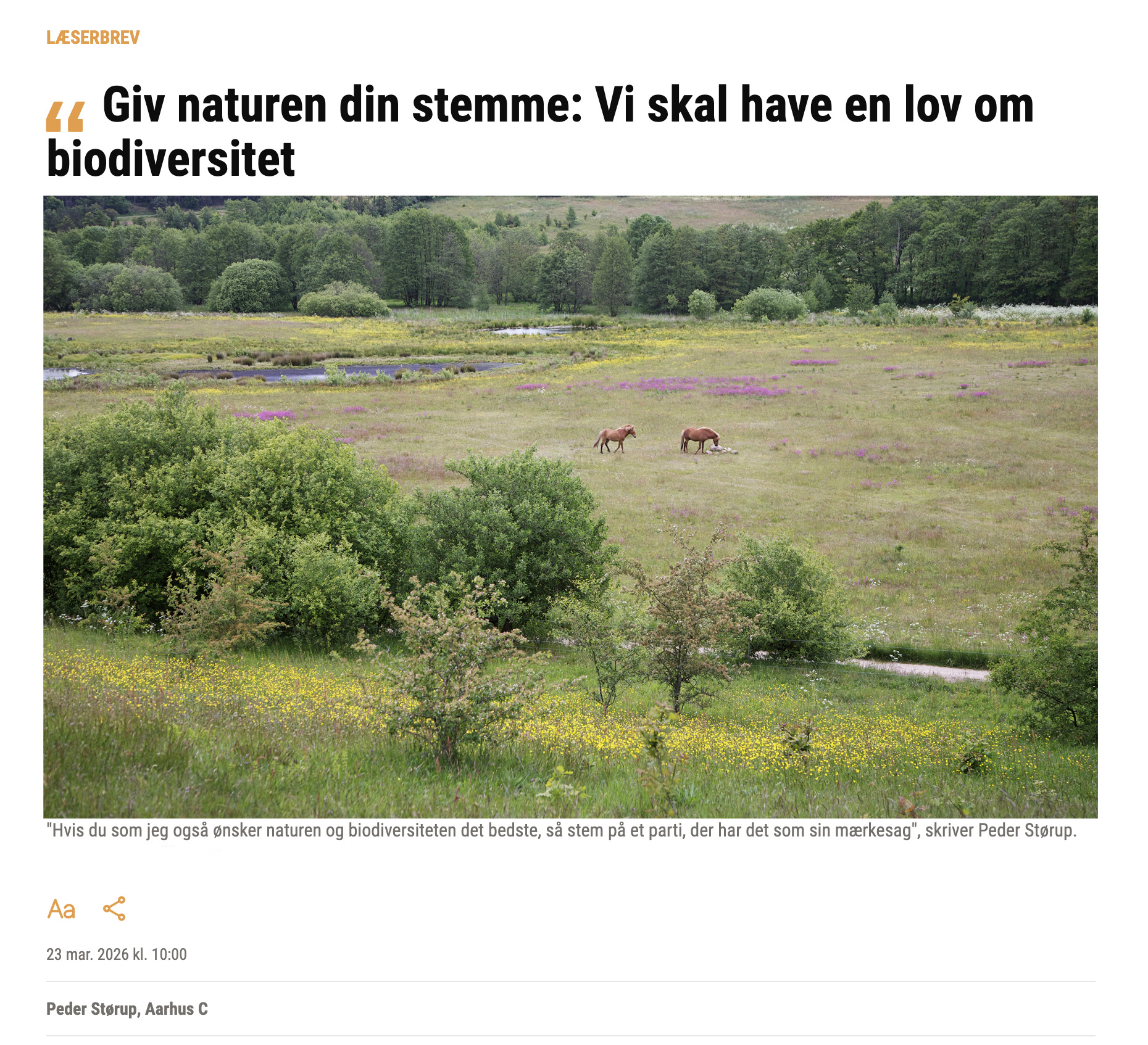 Hvis du som jeg også ønsker naturen og biodiversiteten det bedste, så stem på et parti, der har det som sin mærkesag, at Danmark skal have en biodiversitetslov med en målsætning om 30 procent beskyttet natur i Danmark.